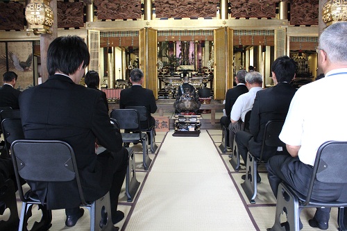 毫摂寺の御門主様らによる読経、参列者のお焼香の後、御法話として、食物に